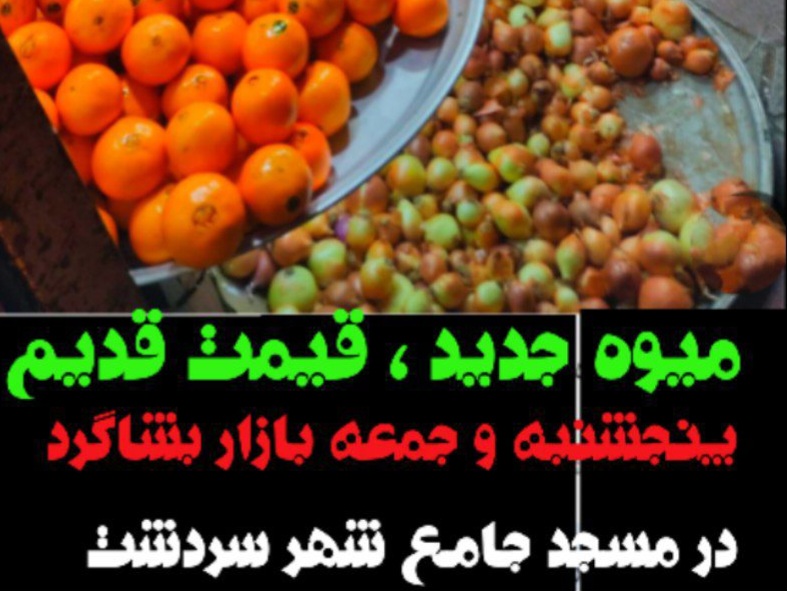 میوه‌فروشی پنجشنبه و جمعه بازار بشاگرد با همت گروه جهادیرهروان ولایت در حیاط مسجد جامع شهر سردشت افتتاح شد و محصولات را با قیمت‌های پیشین عرضه می‌کند.